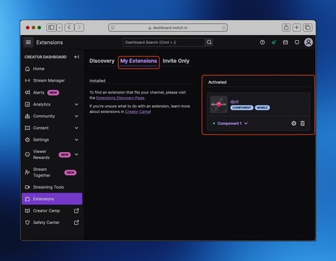 You can confirm your extension is active through the “Creator Dashboard” in the “My Extensions” section. Notice the djctl extension is marked as “Activated” and assigned to “Component 1”.